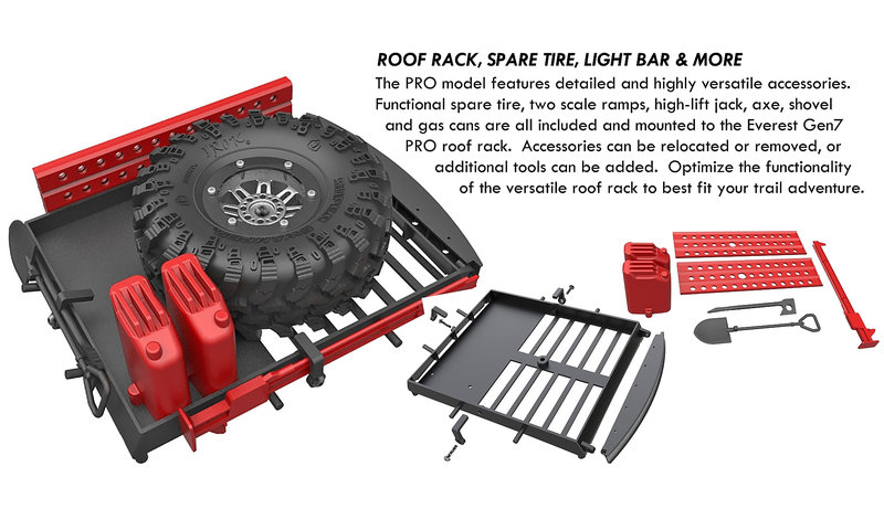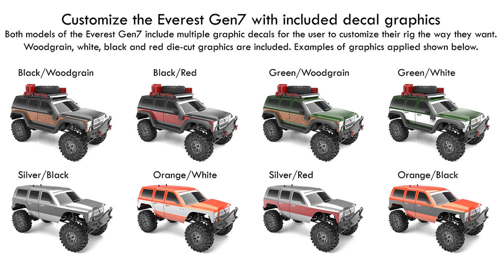 Nabízená provedení Redcat Everest Gen7 a Gen7 Pro; jelikož se jedná o RTR sety, lexanová karoserie ve stylu amerického trucku je dodávána již nabarvená: